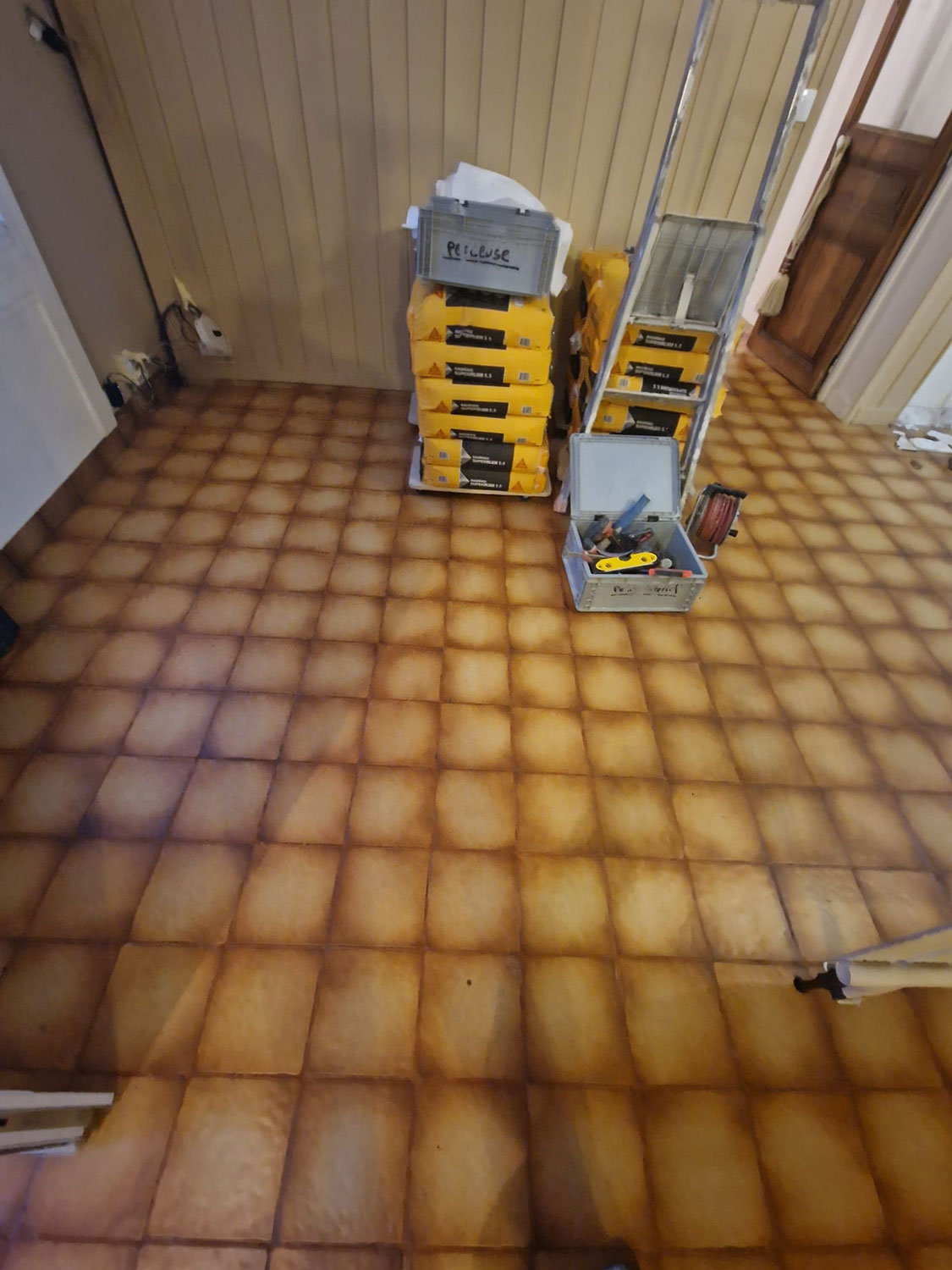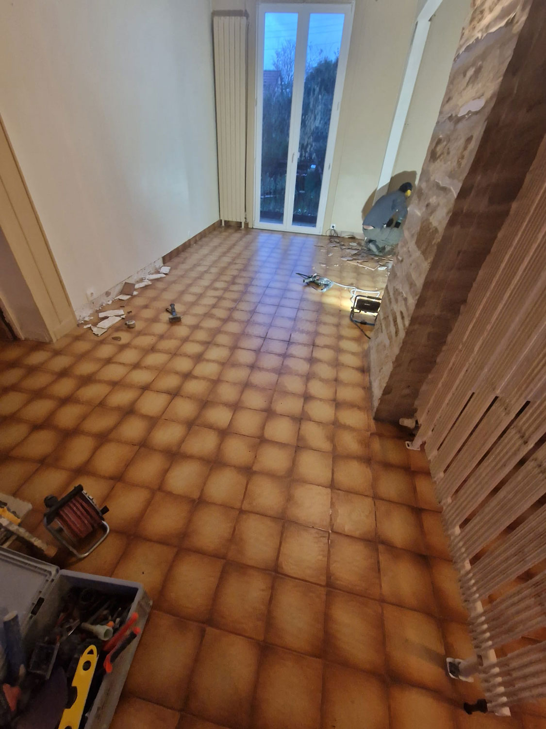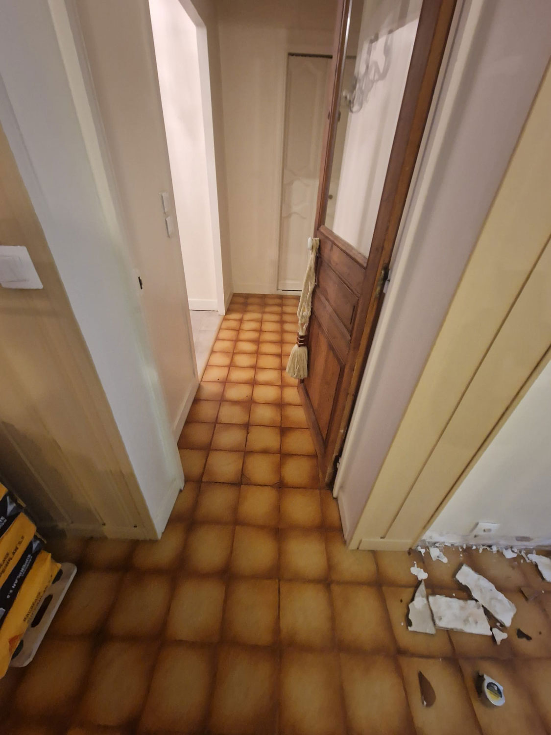 • Préparation de surface : Dépose complète de l’ancien revêtement et réalisation d’un ragréage sur 60 m² pour obtenir une planéité parfaite, indispensable pour les carreaux de grand format.