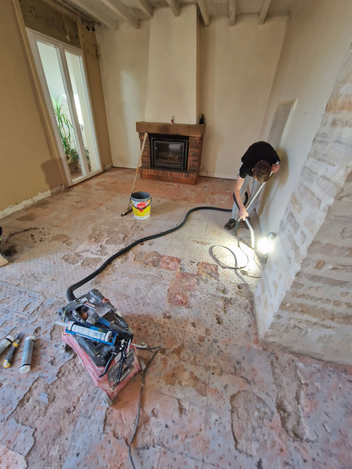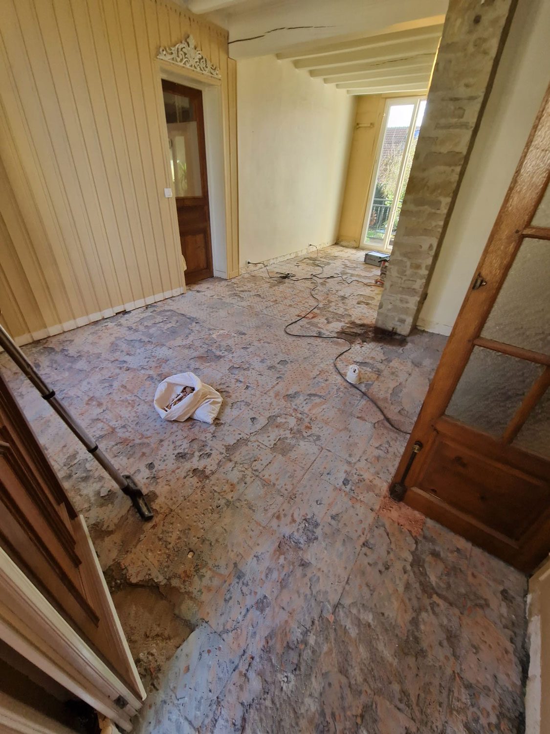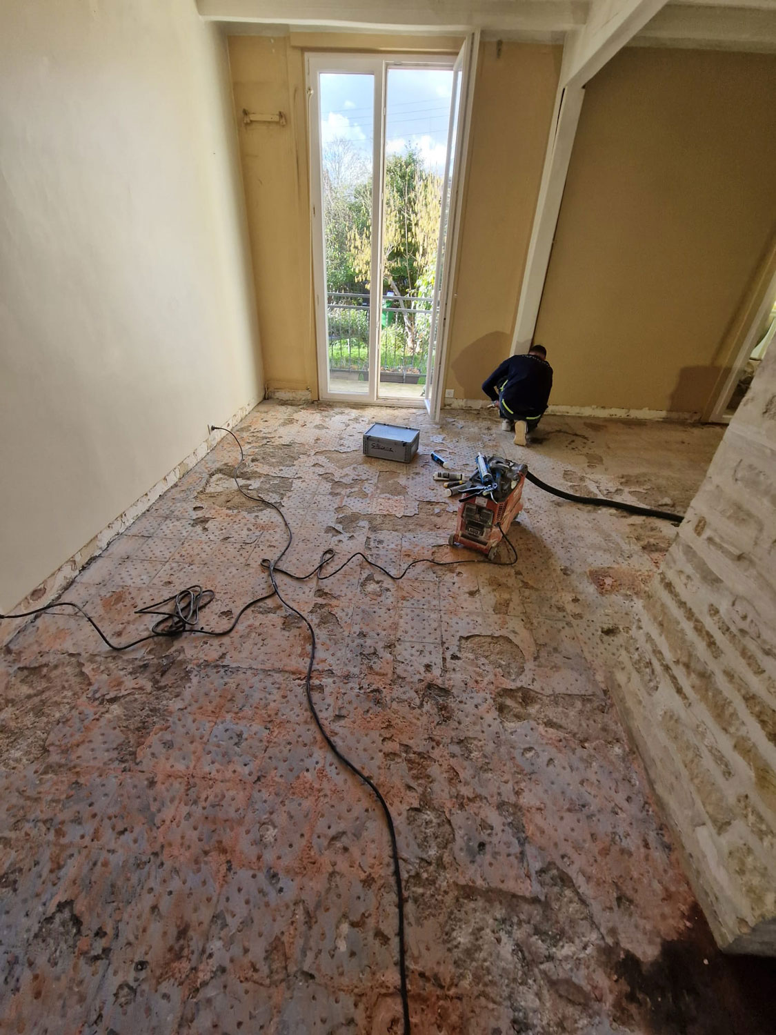 • Préparation de surface : Dépose complète de l’ancien revêtement et réalisation d’un ragréage sur 60 m² pour obtenir une planéité parfaite, indispensable pour les carreaux de grand format.