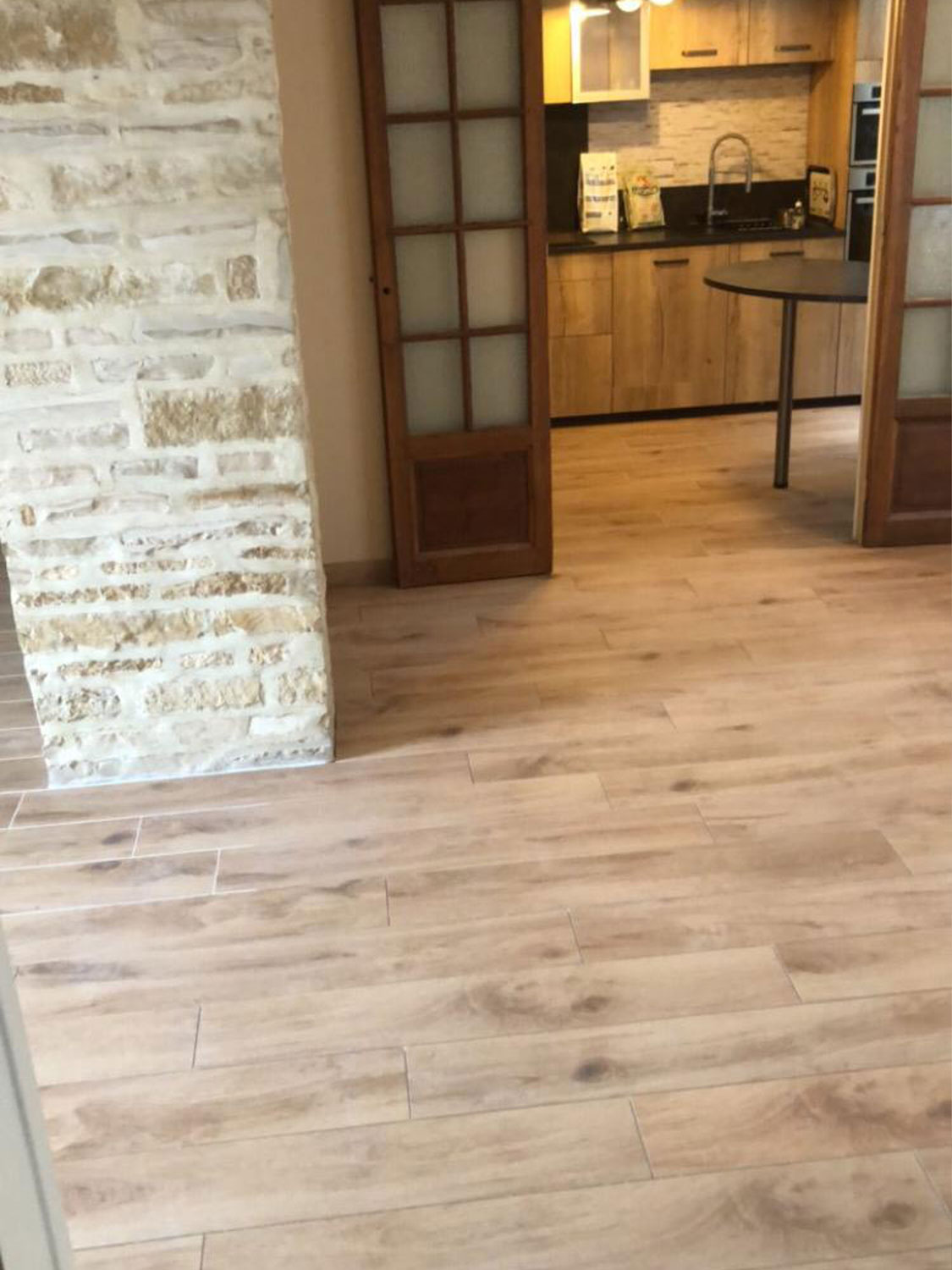 • Carrelage imitation parquet : Pose soignée d’un carrelage effet bois avec un calpinage précis, créant une continuité visuelle entre l’entrée et les pièces de vie.