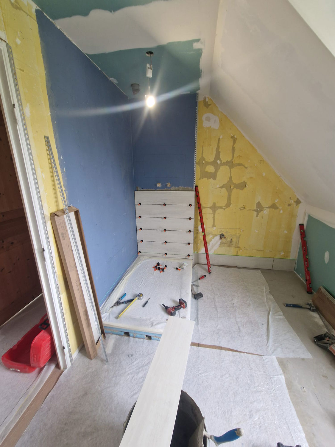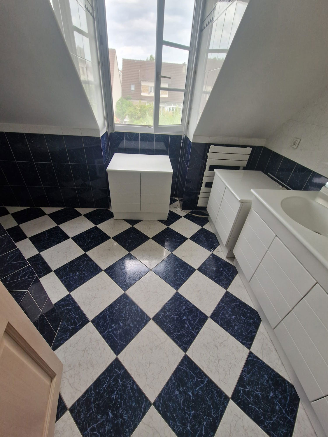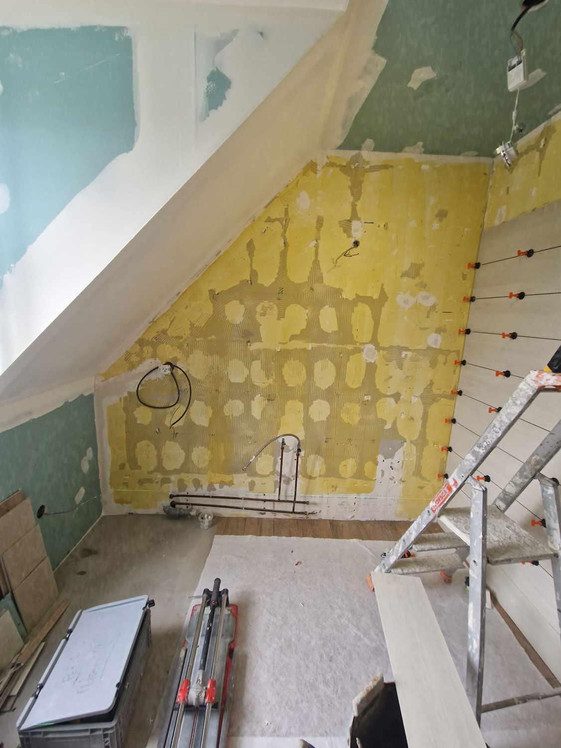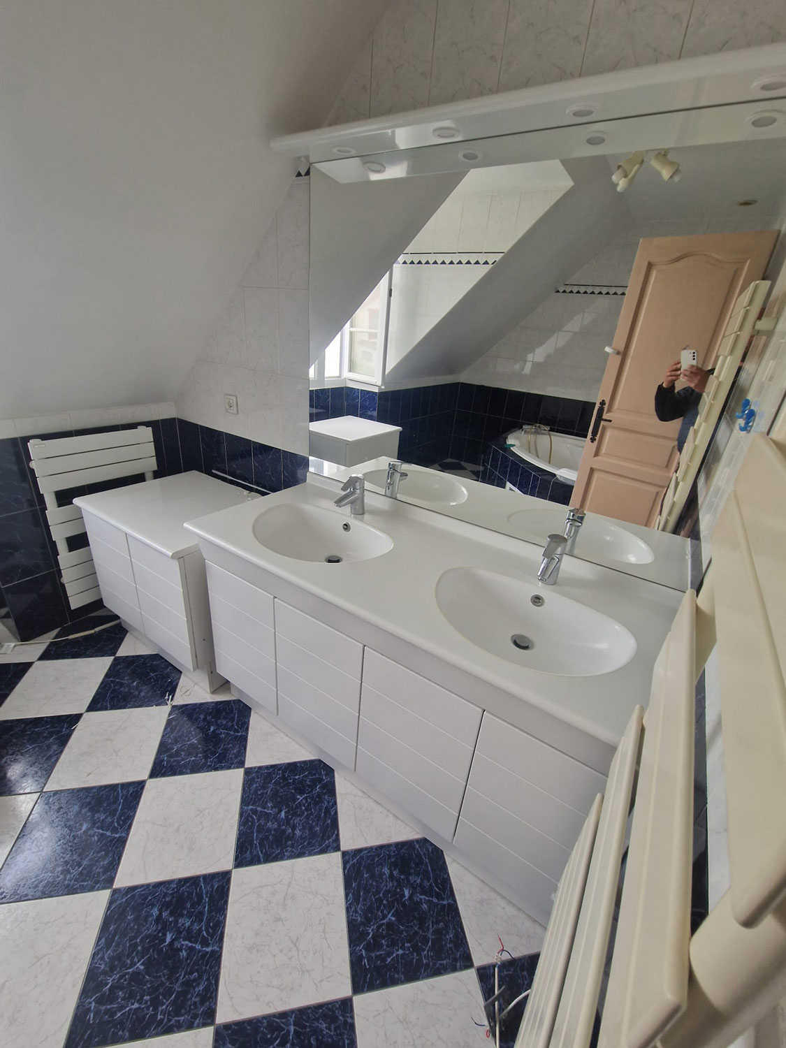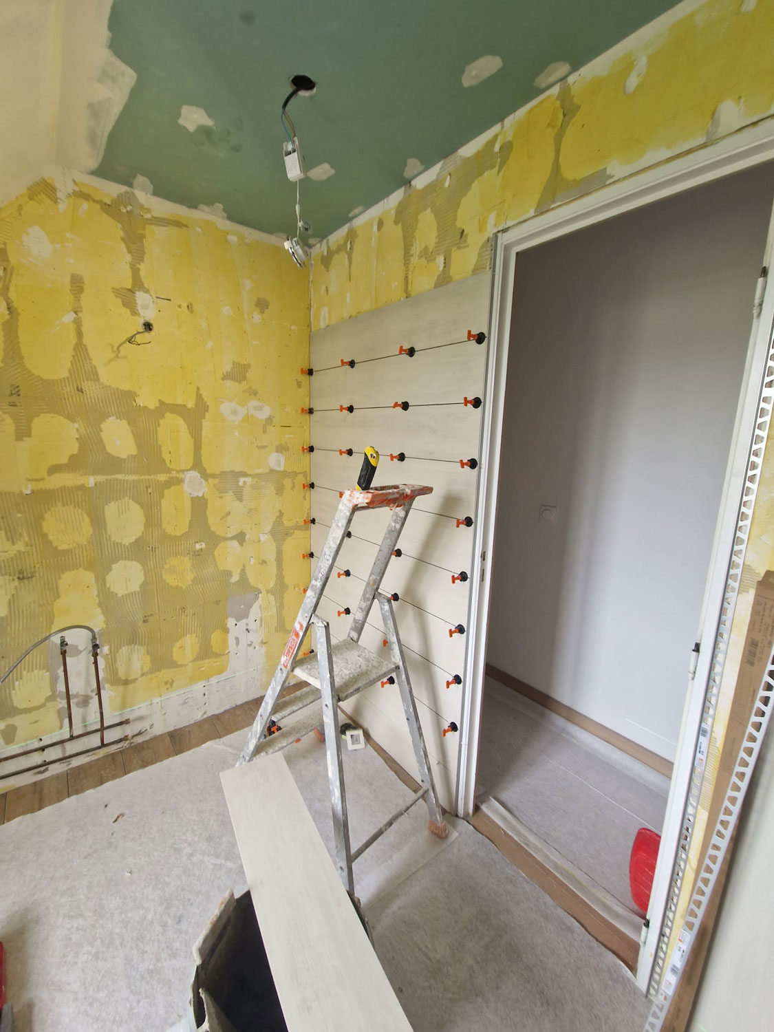 - Dépose et mise à nu : Évacuation de l’ancienne faïence, des sanitaires et des radiateurs. Remise à neuf des parois (doublage placo) et étanchéité complète (système Aqua Stop) pour garantir la pérennité de l’ouvrage.