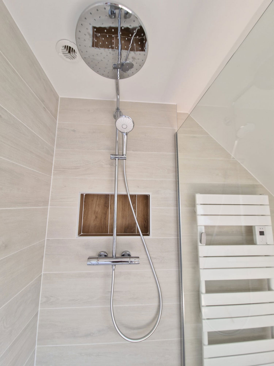 - Création sur-mesure : Nous avons conçu une cloison de douche avec niche intégrée, permettant de ranger les produits de soin sans encombrer l’espace. Un faux plafond avec spots LED intégrés a également été créé pour une ambiance lumineuse chaleureuse et moderne.