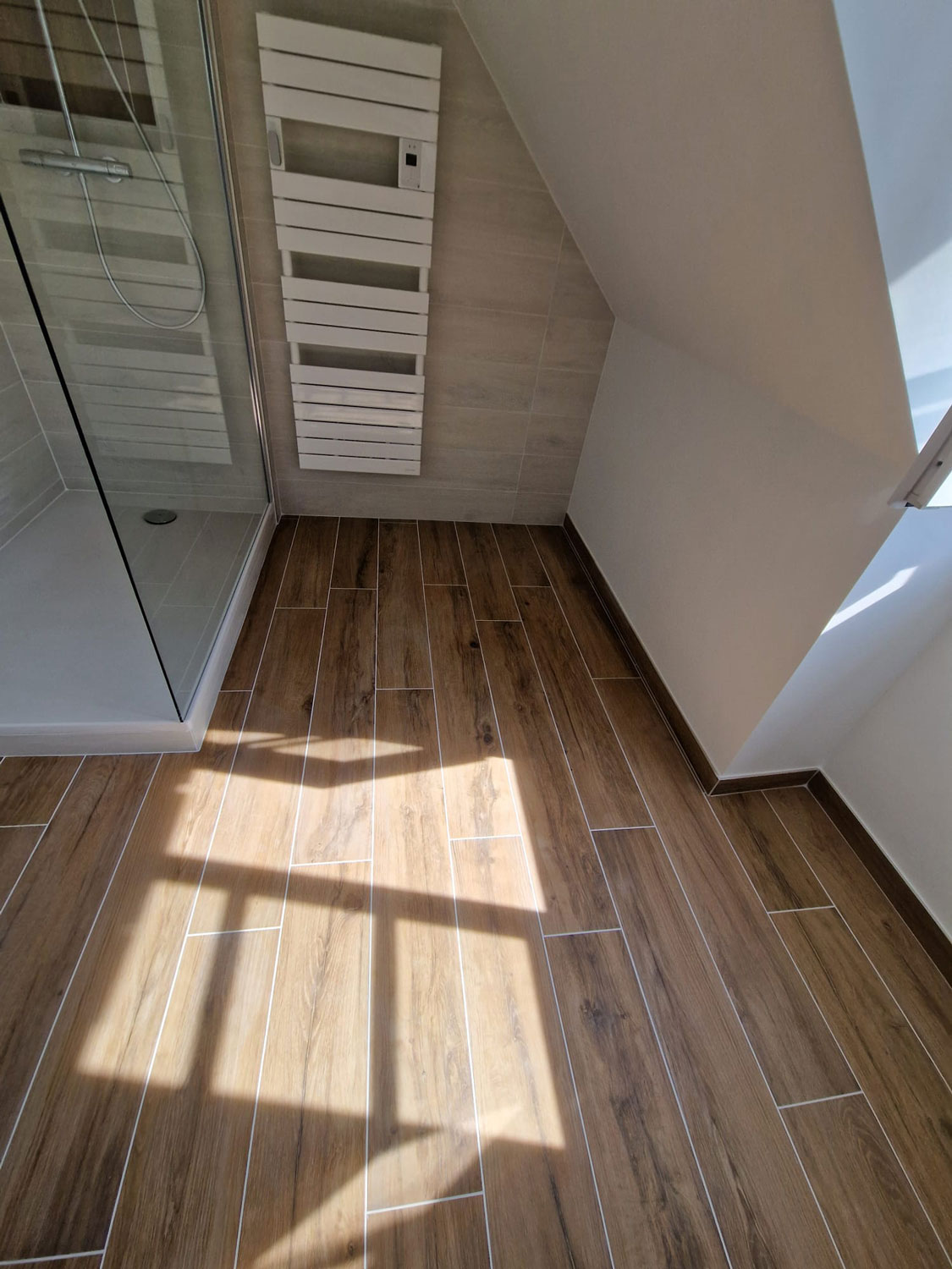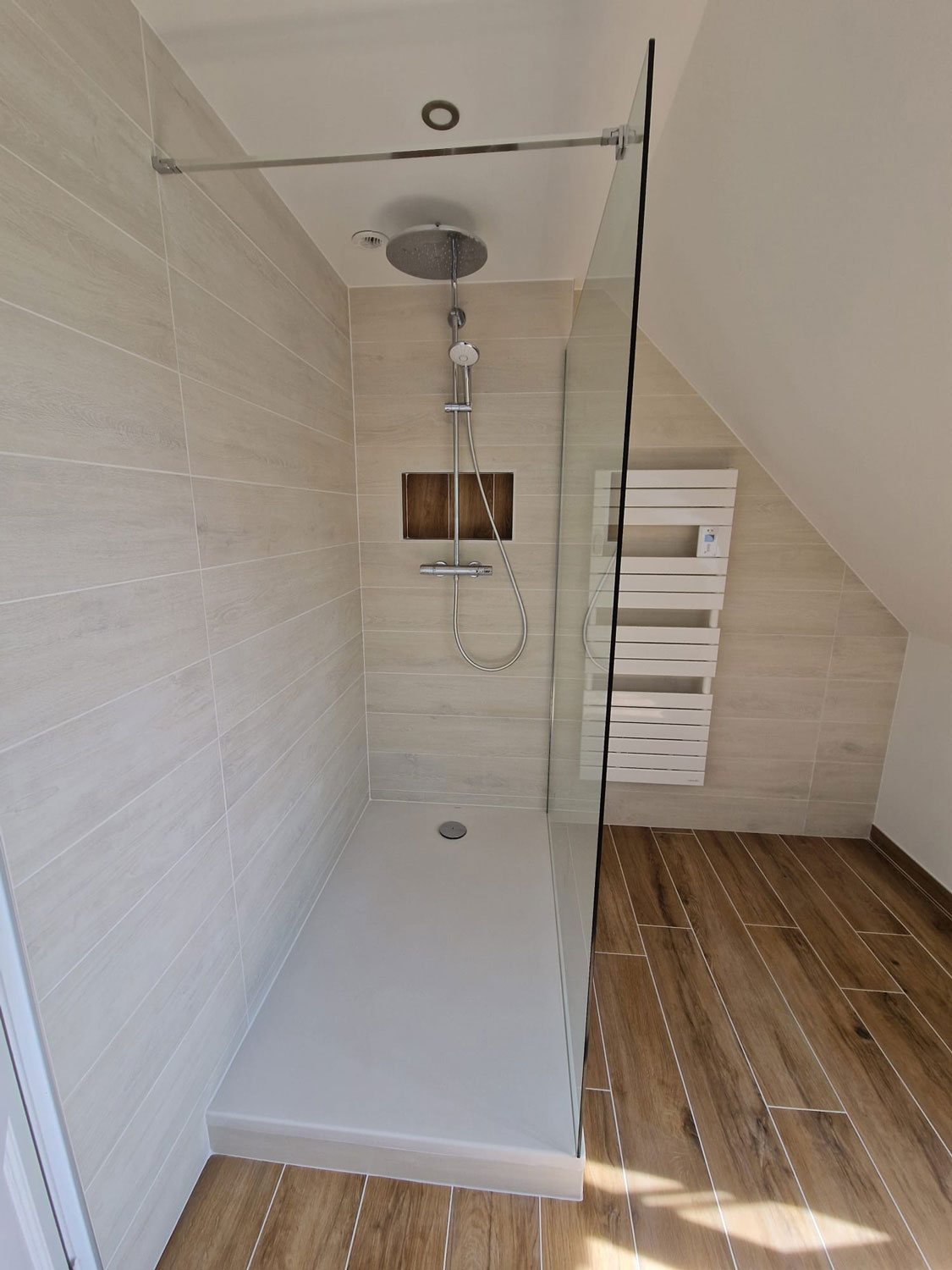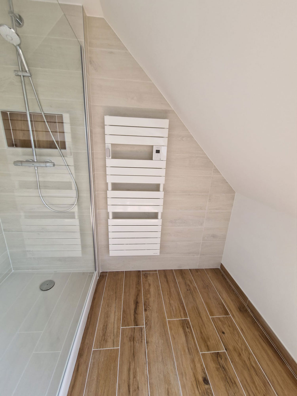 Le client souhaitait remplacer une ancienne baignoire d’angle, devenue encombrante et difficile d’accès, par une vaste douche à l’italienne. L’objectif était triple : gagner en espace, moderniser l’esthétique et optimiser le confort thermique de la pièce.