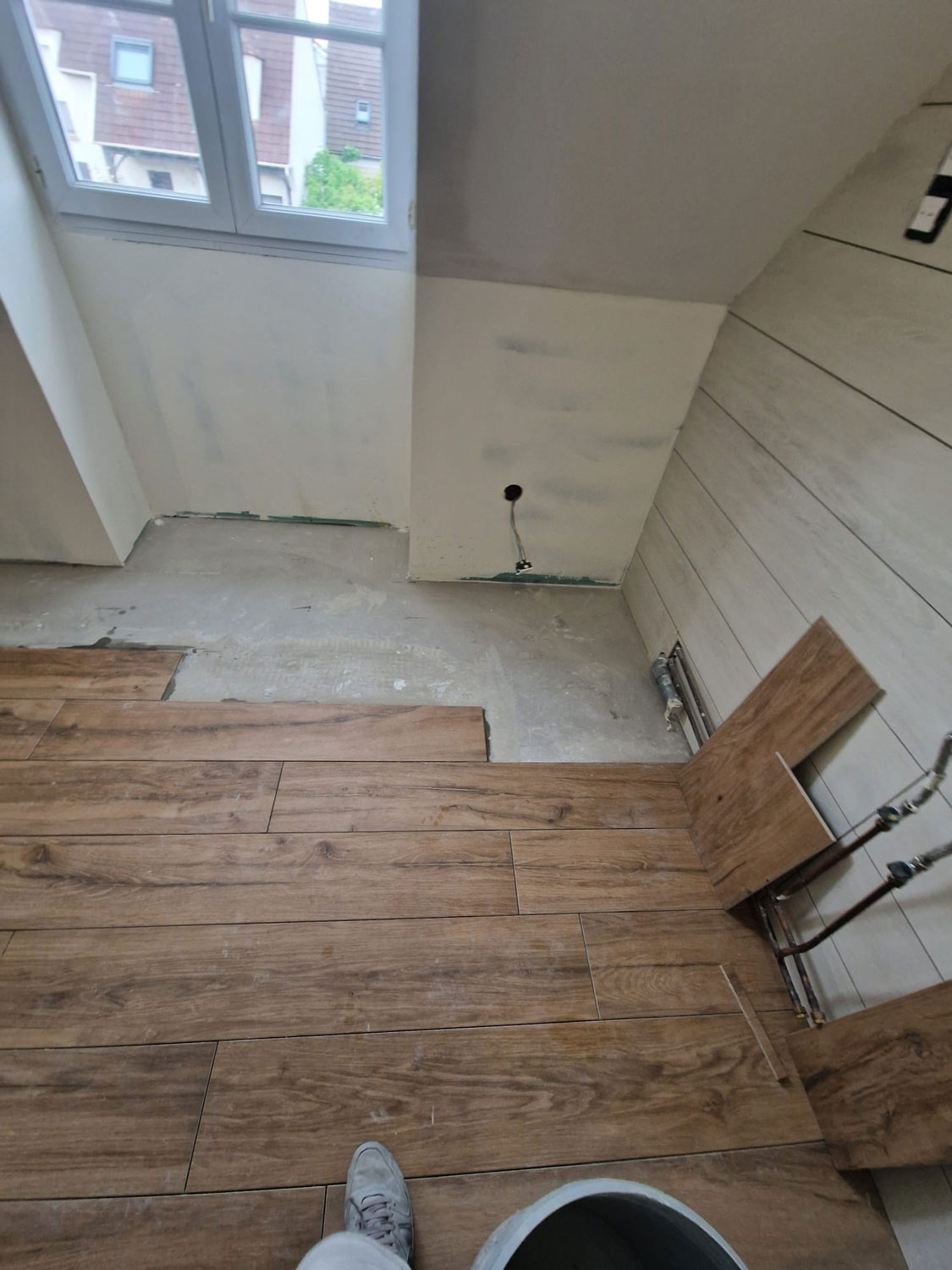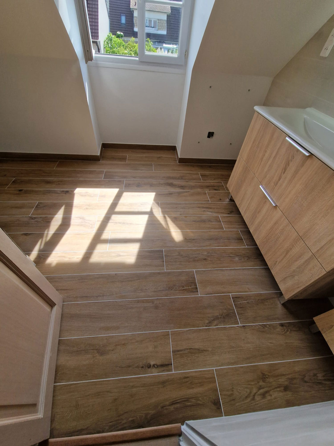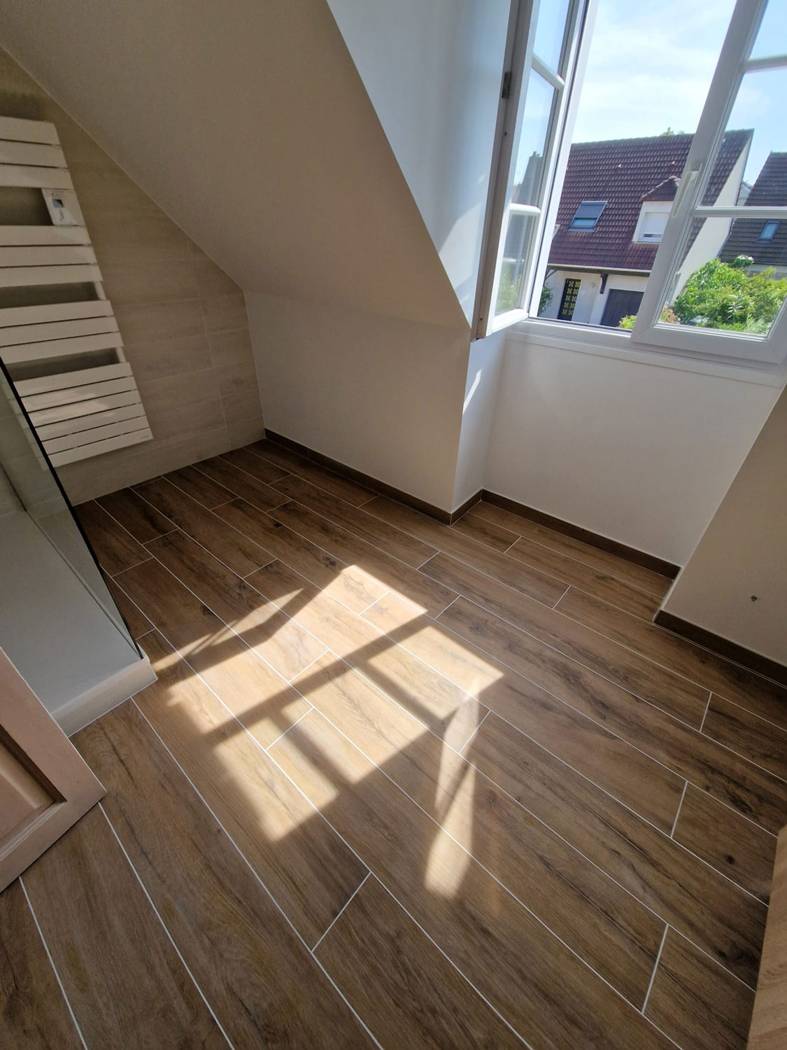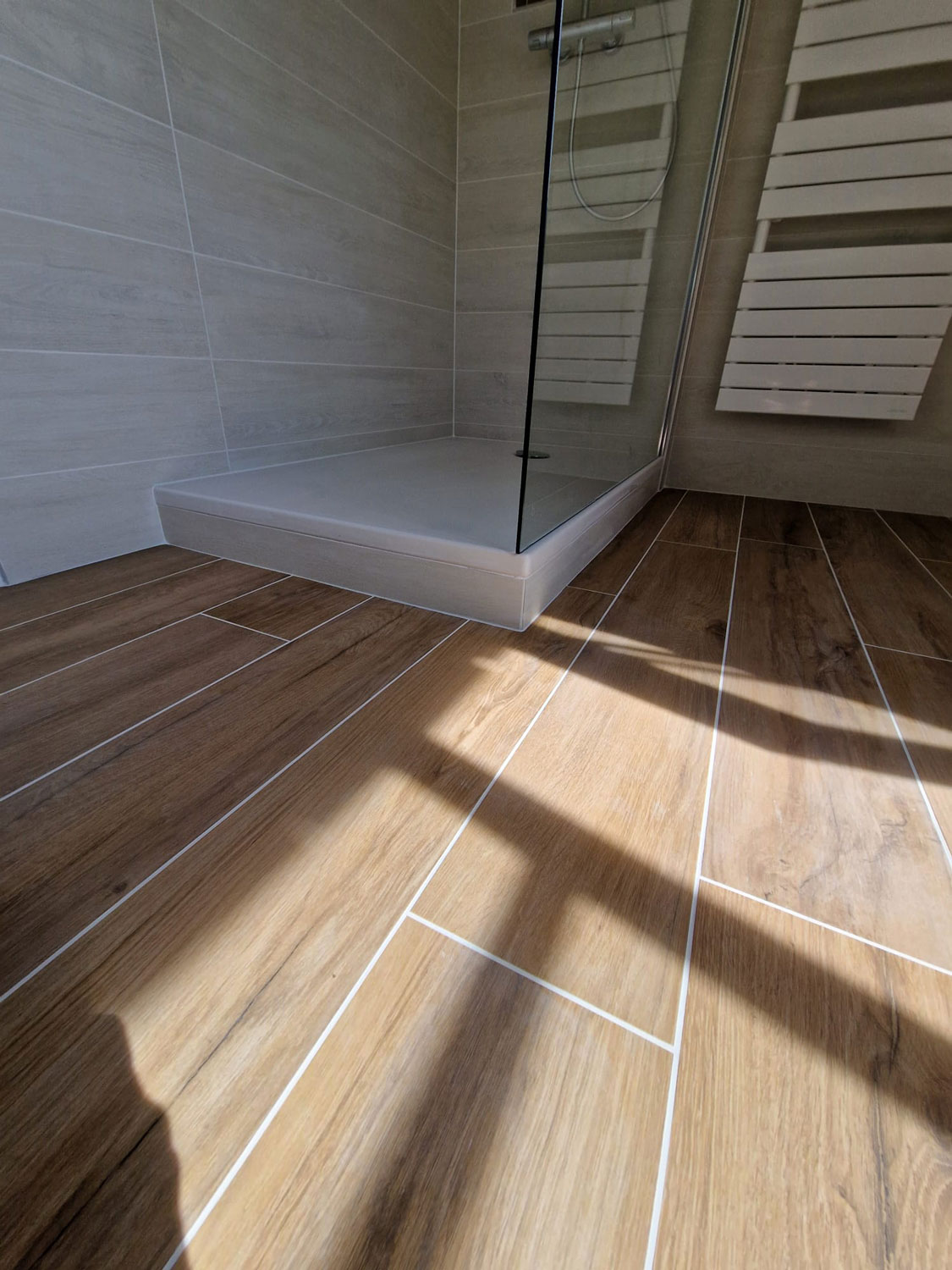 Le client souhaitait remplacer une ancienne baignoire d’angle, devenue encombrante et difficile d’accès, par une vaste douche à l’italienne. L’objectif était triple : gagner en espace, moderniser l’esthétique et optimiser le confort thermique de la pièce.